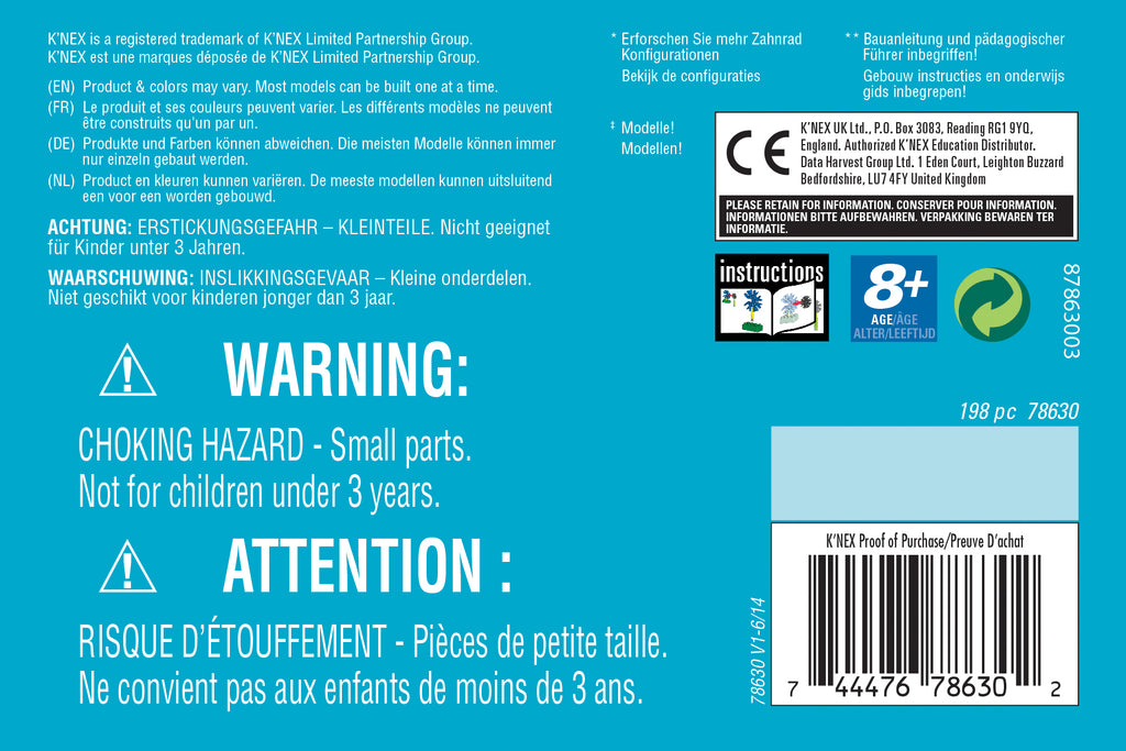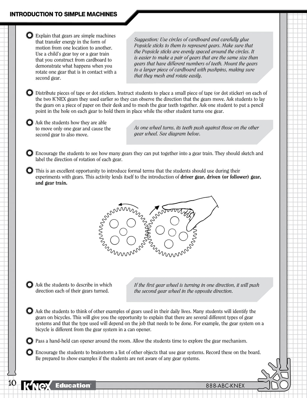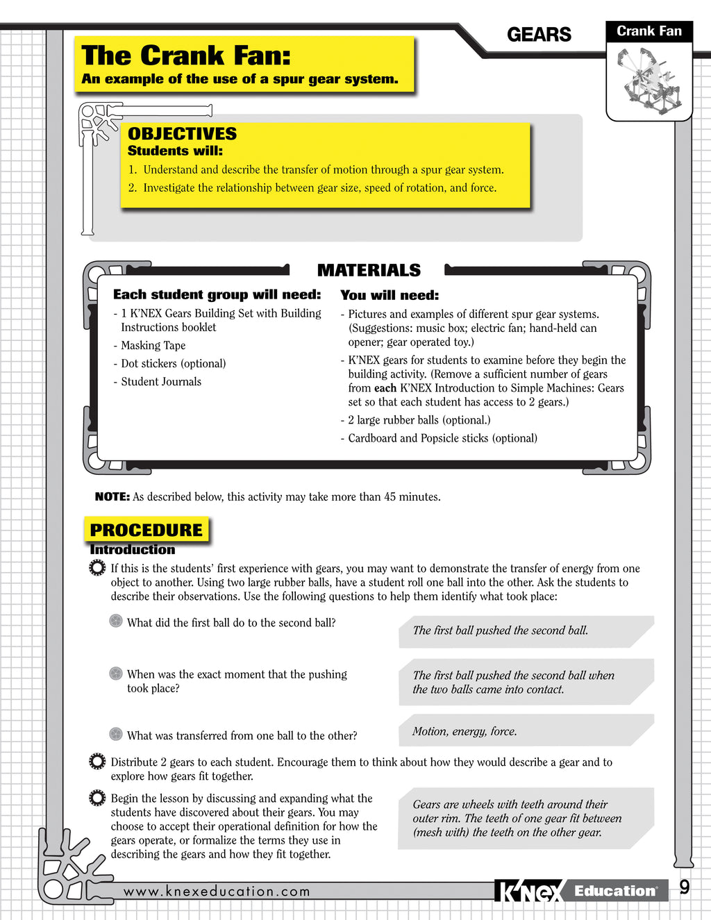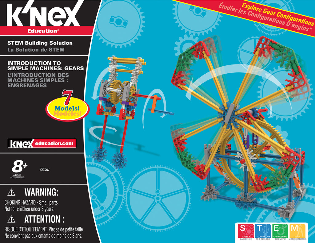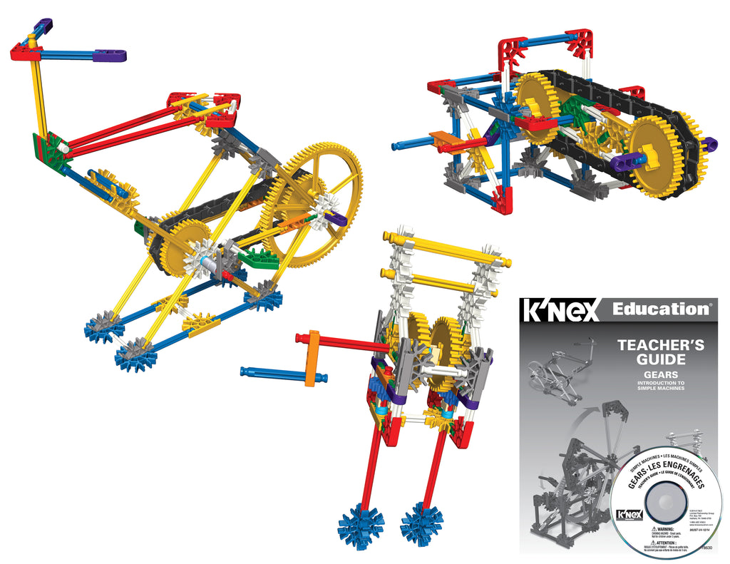Sprocket Gears! Spur Gears! Rack & Pinion! And More! The K'NEX® Education Gears set is designed to introduce students to the scientific concepts associated with gears. Students are provided with the opportunity to acquire skills using a hands-on, inquiry-based approach to information and concepts as they build, investigate, discuss, and evaluate scientific principles in action. The Teacher's Guide provides the information and resources needed to build students' understanding of scientific concepts and channel their inquiries into active and meaningful learning experiences. Extension activities to explore the concepts more deeply are also included. Set includes 198 K'NEX® parts – enough to build 7 fully-functioning replicas of real-world machines, one at a time. Supports 2 – 3 students working as a team. Grades 3 -5. Building instructions and comprehensive teacher's guide aligned to Science, Technology, Engineering and Math Standards included. Packaged in a strong storage tray with snap-on lid. STEM Education focuses on science, technology, engineering and mathematics concepts taught through problem-solving, discovery, exploratory learning and critical thinking. STEM Education requires students to be active participants in the learning. K'NEX® models offer hands-on learning opportunities that encourage scientific inquiry, investigation and experimentation. Our inquiry-based lessons challenge students as they build, investigate, problem solve, discuss, and evaluate scientific and design principles in action. Aligned to Science, Technology, Engineering, and Math standards. Also see K'NEX® Education's Intro to Simple Machines: Levers and Pulleys and Intro to Simple Machines: Wheels & Axles and Inclined Planes, and Simple Machines Deluxe for grades 3-5 and Exploring Machines for grades 5 - 9. Includes Teacher Guide on CD!