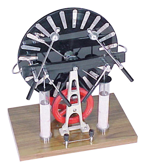 Two plates 250mm in diameter are supported in two rigid uprights and driven by hand in opposite directions. They are heavy, high-resistance plastic with sectors of aluminum sheets. Leyden jars (condensers) made of borosilicate glass and aluminum foil store electricity until discharged by the dischargers. The whole unit is mounted on a wooden base.