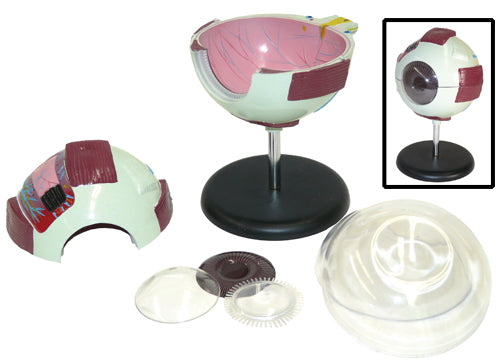 A highly detailed eye model to satisfy beginning students. Dissectible into 7 parts that include: top section, vitreous body, bottom section, lens (2 parts), iris, cornea. Mounted on a stand. Includes keycard with 41 structures labeled. Enlarged 6 times. Size 5 1/2" x 6 1/4"