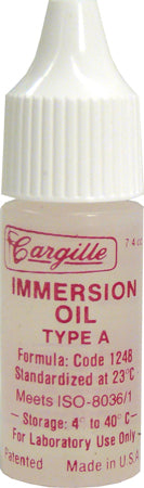 Cargille Immersion Oil is required for high magnification and to obtain sharp images with clear resolution. These Immersion oils meet ISO standards for quality. Type A (low viscosity) and Type B (high viscosity) are used for normal microscopy applications with viscosities from 150-1250 (centistokes). The greater the gap between cover glass and objective, or condenser and slide, the more desirable high viscosity becomes. Type A and B are both used for most fluorescent microscopy applications, but Type A has a lower viscosity, which reduces any tendency to trap air causing image degradation and is easier to clean up.