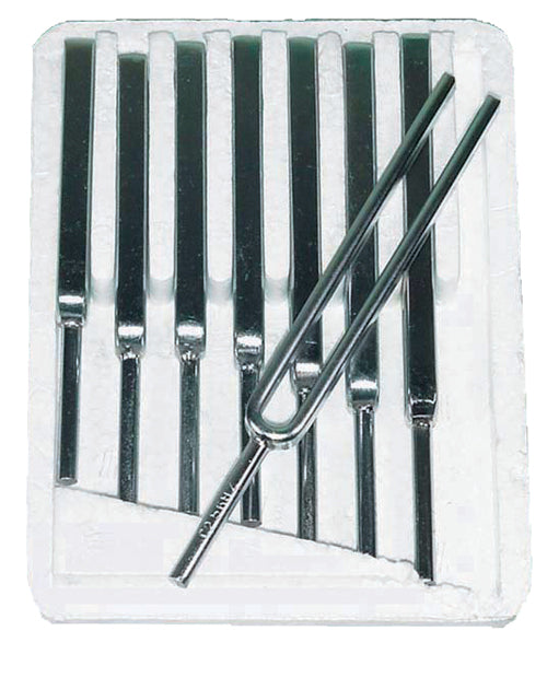 Steel N.P. Tuning Forks set of 8, with long handle for convenient handling. Frequency engraved on handle. Packed in thermocole box of storage. 1 each of. Key: C Frequency: 256 Hz Key: D Frequency: 288 Hz Key: E Frequency: 320 Hz Key: F Frequency: 341.3 Hz Key: G Frequency: 384 Hz Key: A Frequency: 426.6 Hz Key: B Frequency: 480 Hz Key: C Frequency: 512 Hz